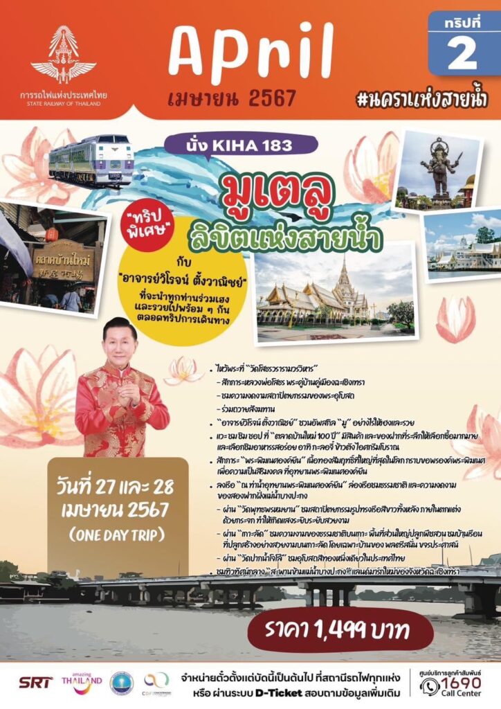 ทริปที่ 7 และ 8 แบบไปเช้าเย็นกลับ (วันที่ 27 และวันที่ 28 เมษายน 2567) โปรแกรม “มูเตลู ลิขิตแห่งสายน้ำ” ที่จังหวัดฉะเชิงเทรา พาไปมูเตลู เสริมสิริมงคล เปิดโชครับทรัพย์ เพิ่มวาสนา เติมบารมี ตามตำราศาสตร์เส้นสายมังกร กับ “อาจารย์วิโรจน์ ตั้งวาณิชย์“ คนละ 1,499 บาท ผู้สนใจสำรองที่นั่งได้ ตั้งแต่วันนี้เป็นต้นไป จำกัด 202 ที่นั่งต่อทริปเท่านั้น โดยราคาดังกล่าวรวมค่าโดยสารรถไฟ ค่าที่พัก ค่ารถบัสปรับอากาศ ค่าเข้าชมสถานที่ต่าง ๆ พร้อมอาหารและเครื่องดื่มแบบจัดเต็มตลอดการเดินทาง จองตั๋วได้ที่สถานีรถไฟทุกแห่งทั่วประเทศ หรือช่องทางการจำหน่ายตั๋วระบบออนไลน์ D-Ticket ของการรถไฟฯ สอบถามข้อมูลเพิ่มเติมได้ที่ ศูนย์บริการลูกค้าสัมพันธ์ หมายเลขโทรศัพท์ 1690 ตลอด 24 […]