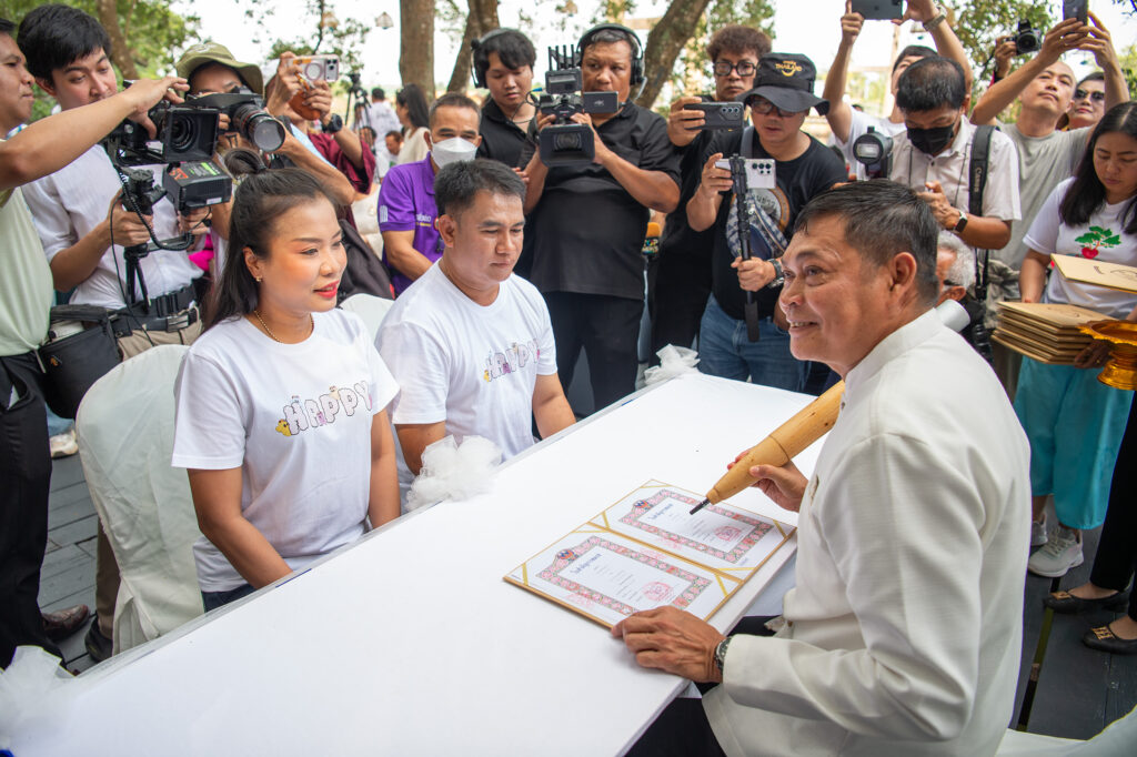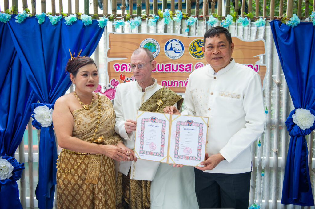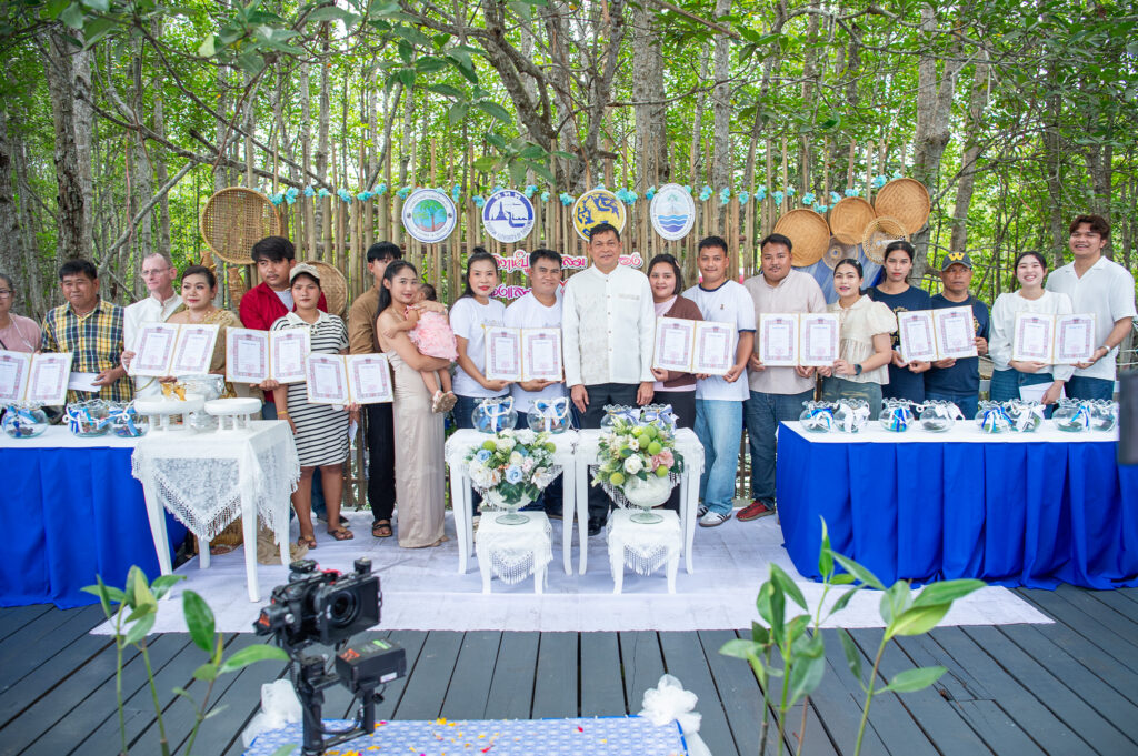 นายอานนท์ วงศ์แย้ม นายอำเภอแกลง จังหวัดระยอง ให้เกียรติมาลงนามในทะเบียนสมรส มอบทะเบียนสมรสกับคู่บ่าวสาว 9 คู่ ที่มาร่วมงานวิวาห์ปู คนในชุมชนร่วมเป็นสักขีพยานท่ามกลางบรรยากาศ ป่าชายเลนอันร่มรื่น ในวันวาเลนไทน์