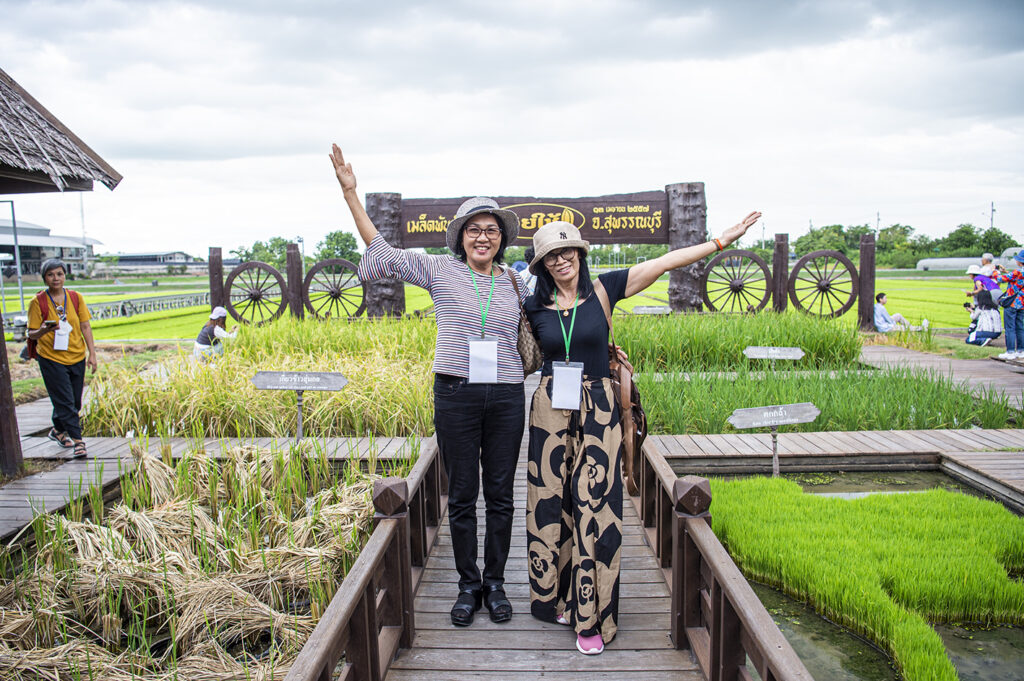 คณะนักท่องเที่ยวมาถึงนาเฮียใช้ก็เข้าห้องประชุม ฟังบรรยายประวัติการก่อตั้งนาเฮียใช้ จากนายนิทัศน์ เจริญธรรมรักษา ผู้ก่อตั้งนาเฮียใช้ และบุตรชายคนโตของคุณพิชัย เจริญธรรมรักษา หรือ เฮียใช้ ออกจากห้องประชุมก็มาถ่ายรูปหมู่ กันที่ป้ายนาเฮียใช้เพื่อเป็นที่ระลึก จากนั้นก็ขึ้นรถรางชมแปลงสาธิตการทำนาแบบใช้นวัตกรรมใหม่ของนาเฮียใช้