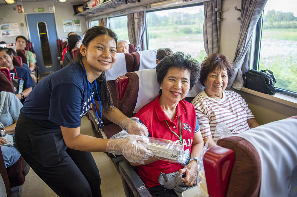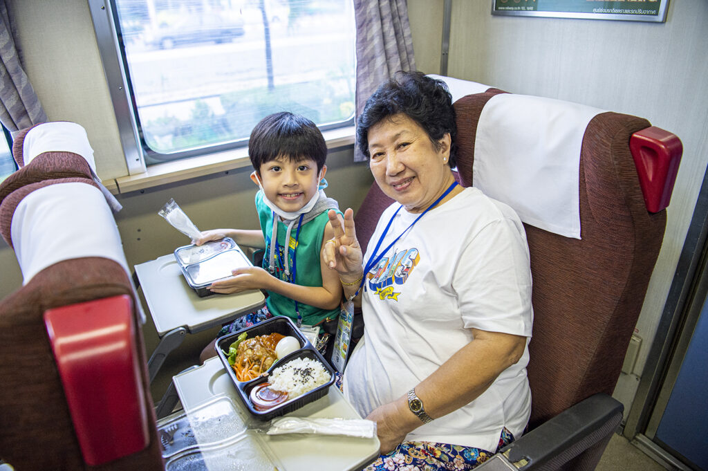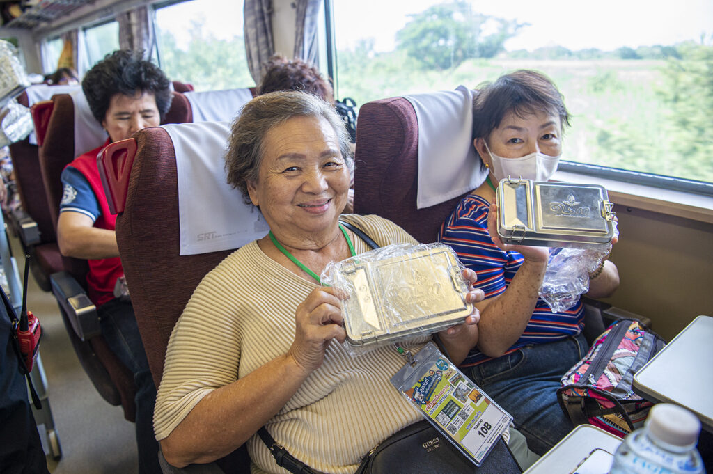 หลังจาก รถไฟ KIHA183 เริ่มออกเดินทางได้สักพัก น้องๆ Staff ก็เริ่มให้บริการอาหารเช้า เมนูวันนี้มีให้เลือก 3 เมนู ข้าวหมูทอด ข้าวไก่ทอด เคียงมาด้วยไข่ต้มยางมะตูม พร้อมน้ำจิ้มแจ่วรสเด็ด อีก 1 เมนู เป็นข้าวราดผัดผัก ไข่เจียว เป็นเมนูสำหรับคนที่ไม่ทานเนื้อสัตว์ เสิร์ฟพร้อมชาเขียว และน้ำเปล่า ใช้เวลาเดินทางประมาณ 3 ชั่วโมง 30 นาที รถไฟ KIHA183 ก็จะถึง สถานีรถไฟสุพรรณบุรี แล้วก็จะเปลี่ยนมาขึ้นรถบัส เพื่อเดินทางต่อไปยังบ้านแหลมโฮมสเตย์