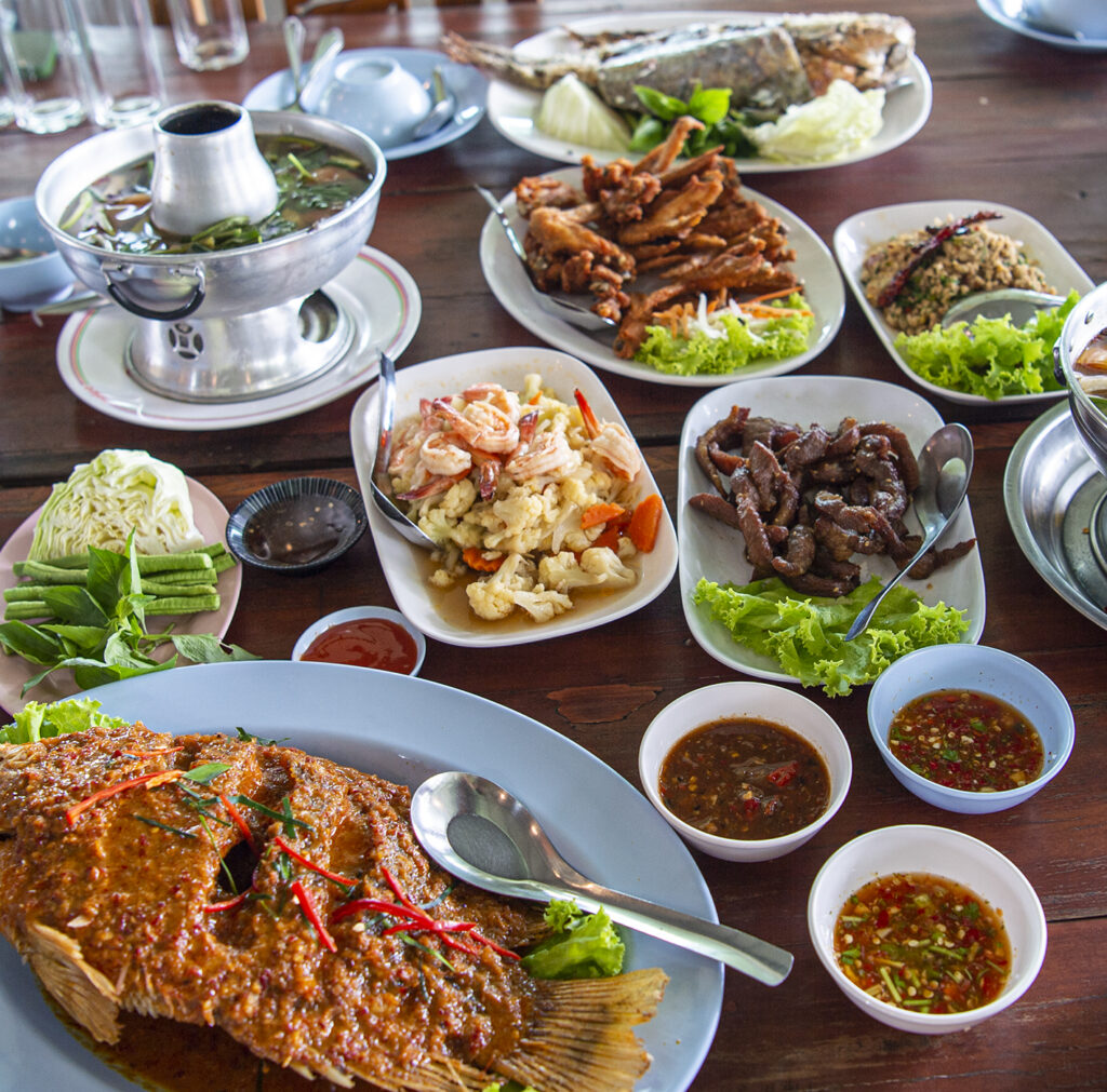 ร้านอาหารครัววังตะแบกกู๊ดวิว บรรยากาศร้านดีด้านหน้าติดถนน ด้านหลังเป็นไร่ข้าวโพด เห็นกังหันลมอยู่ใกล้ๆ ร้านใหญ่รองรับนักท่องเที่ยวได้ทั้ง 200 คน ซึ่งหาได้น้อยร้านที่สามารถรองรับนักท่องเที่ยวกรุ๊ปใหญ่ขนาดนี้ เราจัดให้นั่งโต๊ะ 8 คน เพื่อให้นักท่องเที่ยวทานได้อย่างสะดวกไม่อึดอัดจนเกินไป เมนูวันนี้ ออร์เดิร์ฟเป็นปีกไก่ทอดน้ำปลา หมูแดดเดียว และลาบไก่ ตามมาด้วยเมนคอร์ส ผัดผักรวมกุ้ง ฉู่ฉี่ปลาดนิลทอด ต้มยำปลาคัง และปลานิลเผาสมุนไพร ทำใหม่สดเสิร์ฟร้อน อร่อยทุกเมนู