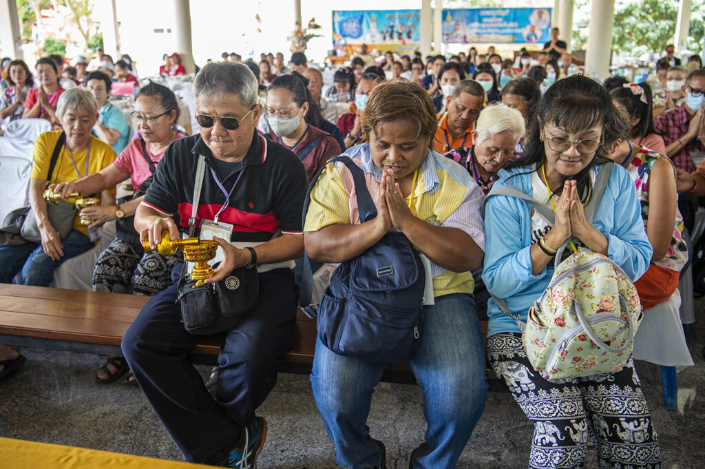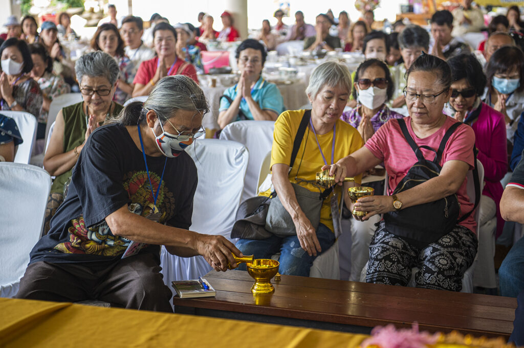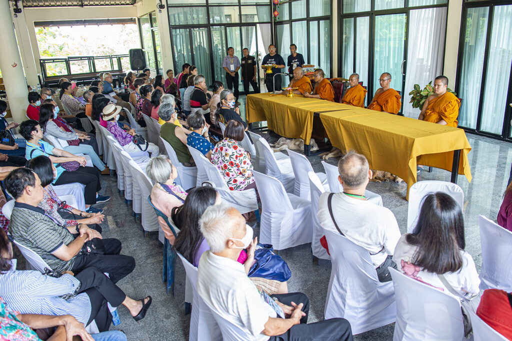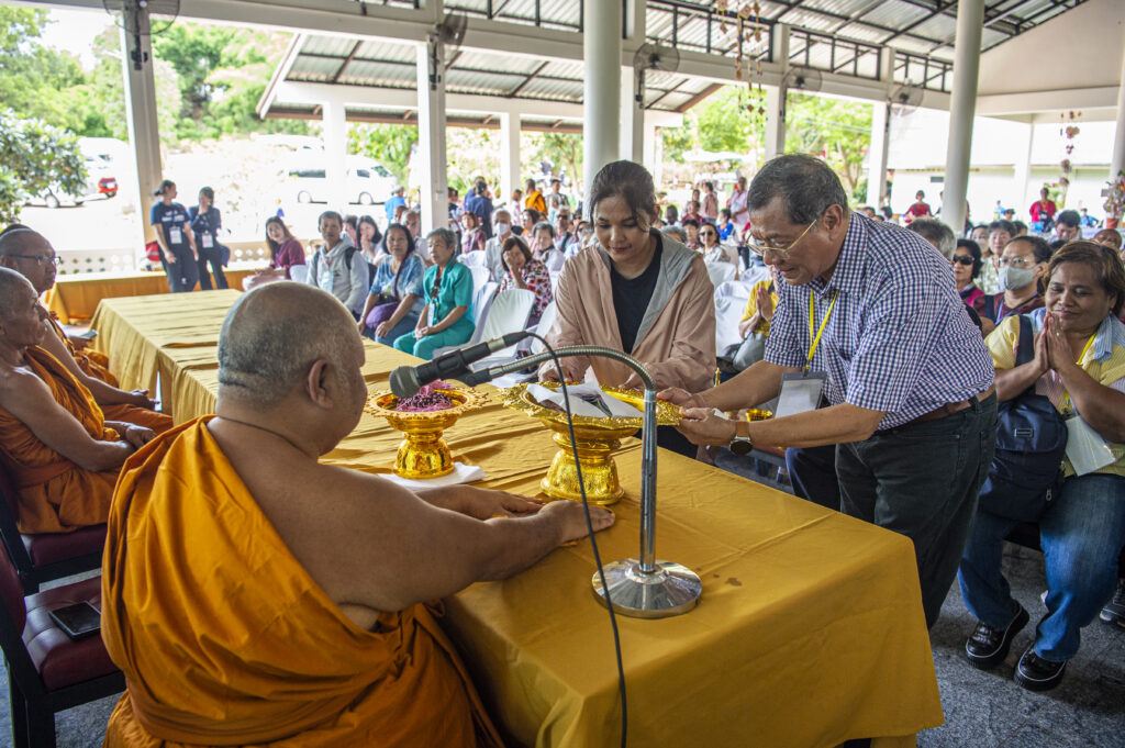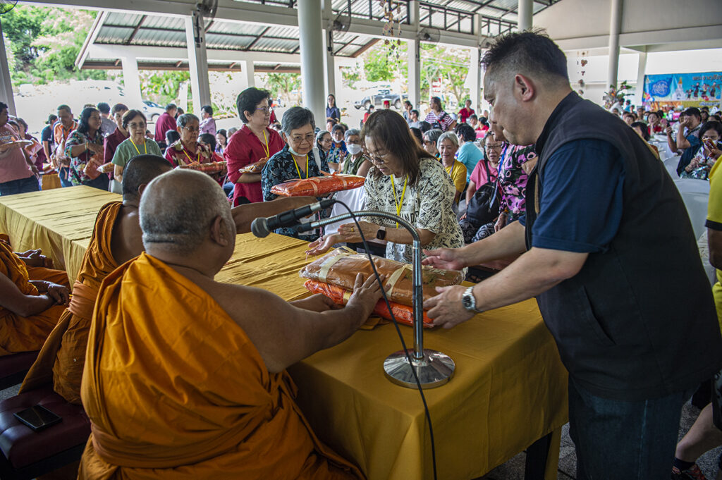 หลังจากทานอาหารกลางวันเรียบร้อย รับศีลรับพร ปะพรมน้ำมนต์จากพระสงฆ์แล้ว ทางวัดได้จัดให้มีพิธี ถวายสังฆทานแด่พระภิษุสงฆ์สายป่า 5 รูป ที่นิมนต์มาจากทั่วประเทศ นักท่องเที่ยวชั้นนำของประเทศในทริปนี้ ร่วมกันบริจาคถวายแด่พระสงฆ์ นอกจากนี้นักท่องเที่ยวยังได้รับกำไลข้อมือ โดยท่านเจ้าอาวาสสวมให้กับมือทุกคน แล้วกำลังจิตศรัทธาที่บริจากให้กับทางวัด