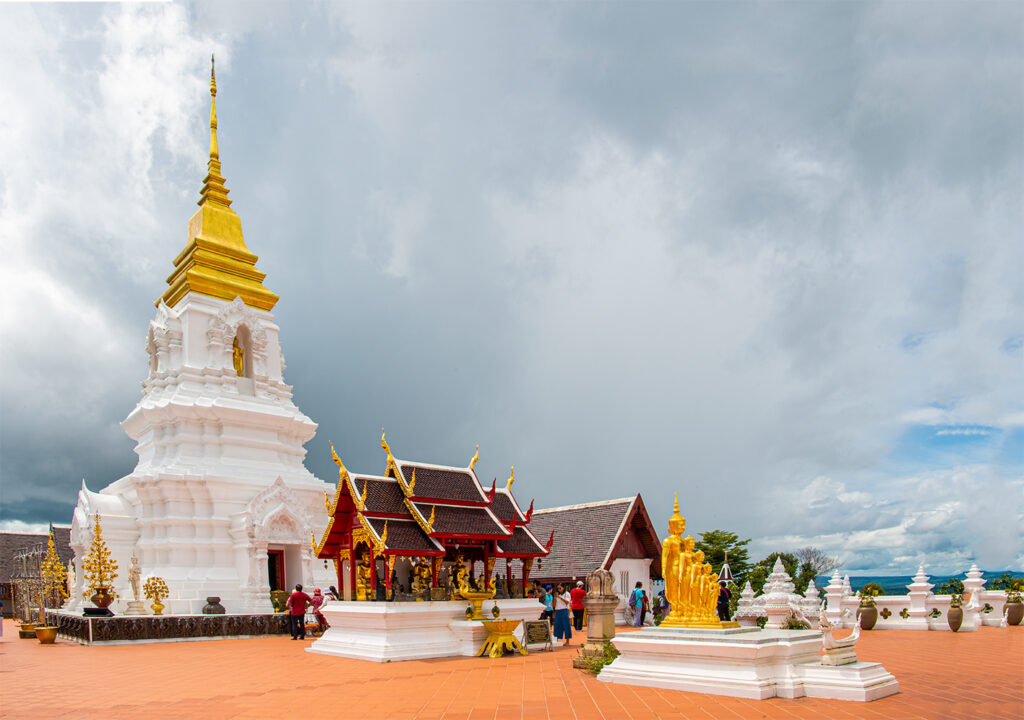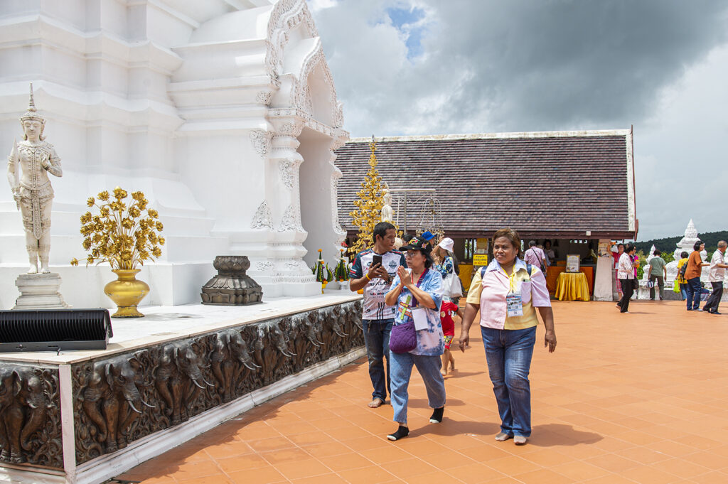 นักท่องเที่ยวทานข้าวเสร็จแล้วก็เดินขึ้นไปกราบ พระมหาธาตุรัชมงคลเจดีย์สิริชัยภูมิ เพื่อความเป็นสิริมงคล ชั้นบนสุดมีเจดีย์ประธานองค์สีขาว ยอดเจดีย์สีเหลืองทอง ตั้งอยู่ตรงการ ใครจะซื้อดอกไม้ธูปเทียน หรือเดินเวียนเทียนบูชาพระธาตุ ก่อนเดินทางไปขึ้นรถไฟ KIHA 183 กับที่สถานีจัตุรัส ในเวลา 15.45