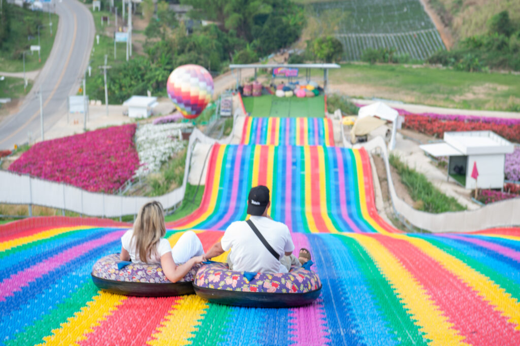 จากนั้นมาเปลี่ยนขึ้นรถสองแถว 4WD ของชาวบ้าน เป็นการกระจายรายได้ลงสู่ชุมชน เพื่อเดินทางต่อมาที่ ไฮเดนเยีย คาเฟ่ ซึ่งเป็นสถานที่ท่องเที่ยวที่จะบรรจุอยู่ในเส้นทางท่องเที่ยวใหม่ ที่เรามาสำรวจในครั้งนี้ ภายใน ไฮเดนเยีย คาเฟ่ มีการปลูกดอก Hydrangea และดอกไม้หลากสีสัน อื่นๆเต็มทั้งภูเขา สวยงาม มีจุดเช็คอินหลายจุด และมี Slider ให้นักท่องเที่ยวได้เล่นสนุกด้วย