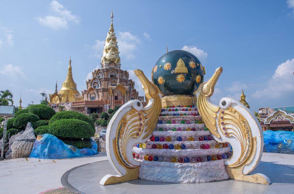 ขากลับให้สมาชิกแวะ กราบขอพรพระ 3 วัดดัง เพื่อความเป็นสิริมงคล ในการเดินทางกลับกรุงเทพมหานคร วัดพระธาตุผาซ่อนแก้ว เป็นวัดแรก มีเจดีย์พระธาตุ 9 ชั้นใช้เครื่องเบญจรงค์ เครื่องประดับ ลูกปัด ลูกแก้ว กระเบื้องสี มาตกแต่งพื้นผิวของพระธาตุ บนยอดเจดีย์ บรรจุพระบรมสารีริกธาตุ วัดมีมหาวิหารพระพุทธเจ้า 5 องค์ ประดิษฐานพระบรมสารีริกธาตุ และมีจุดชมวิวอยู่หน้าวิหารพระพุทธเจ้า 5 องค์
